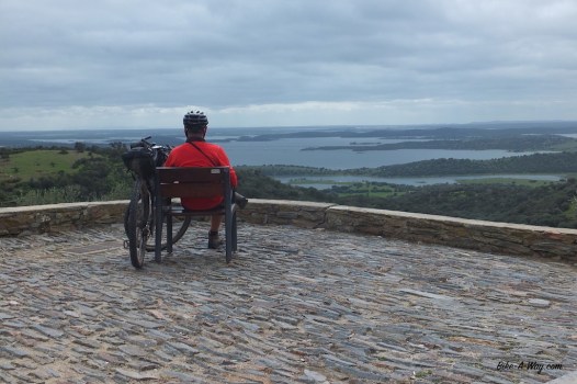 Previous Image Next Image DSCF0784 Upon enterring Monsaraz. Taking a rest from the steep climb and enjoying the view towards Albufeira the Alqueva.