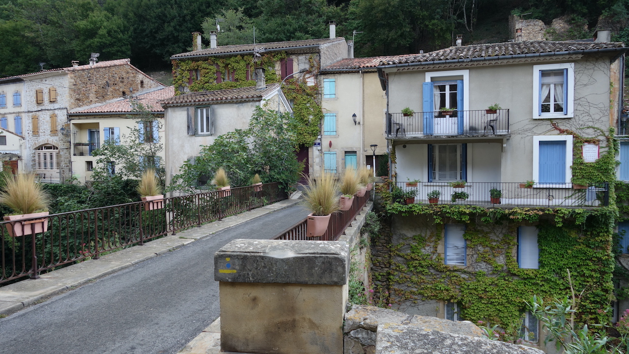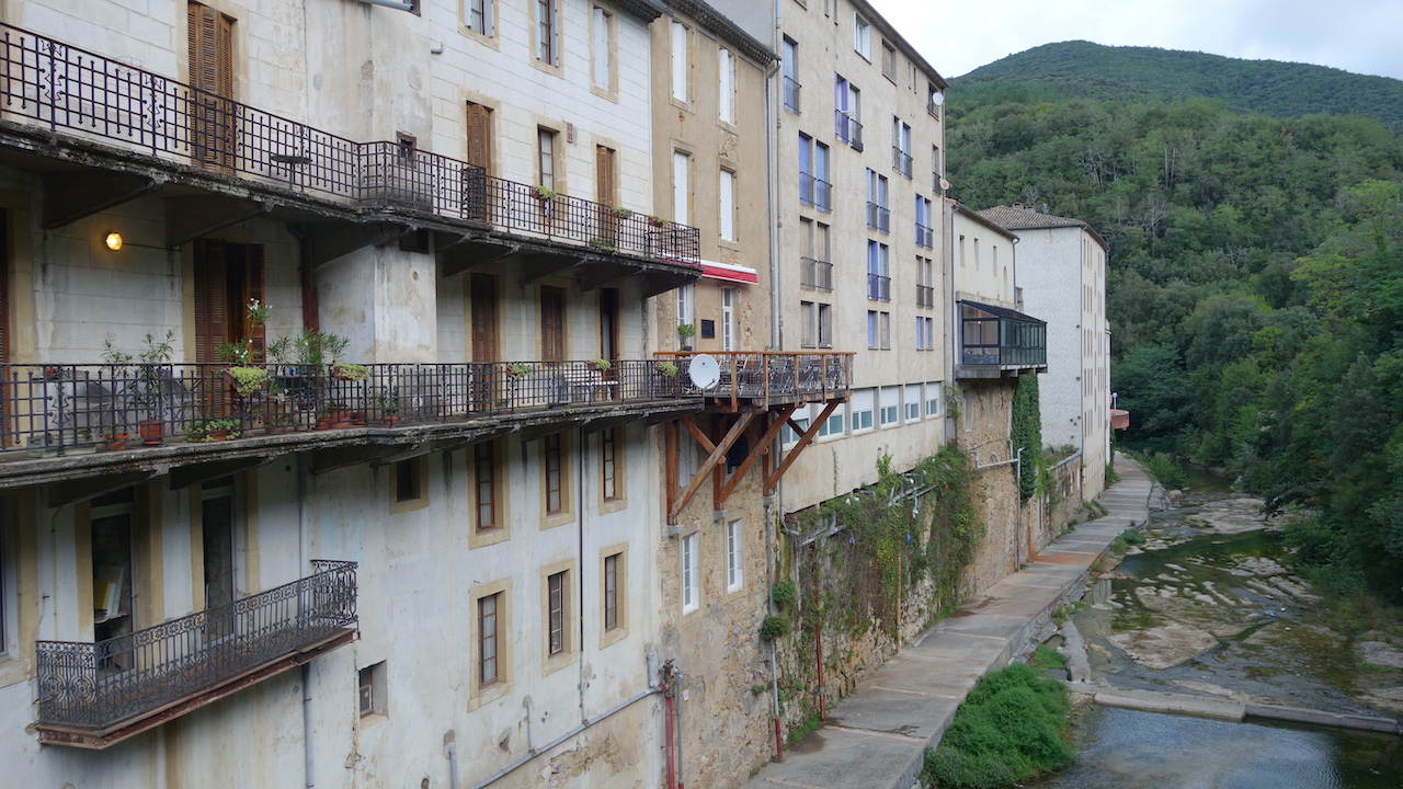 Next day, I am still having spectacular views to the giant of the eastern Pyrenees, Canigou. The beautiful weather of the previous day deteriorates again and by the time I enter the narrow Gorges (canyon) du Galamus, the first raindrops fall. Once over the Coll Du Linas, the road goes down very, very smoothly. I find a good spot for the night in a filed, out of sight of everybody just before Rennes-les-Bains. The next day starts cloudy and wet, so after packing up, I linger for a while in a small coffee bar in town.