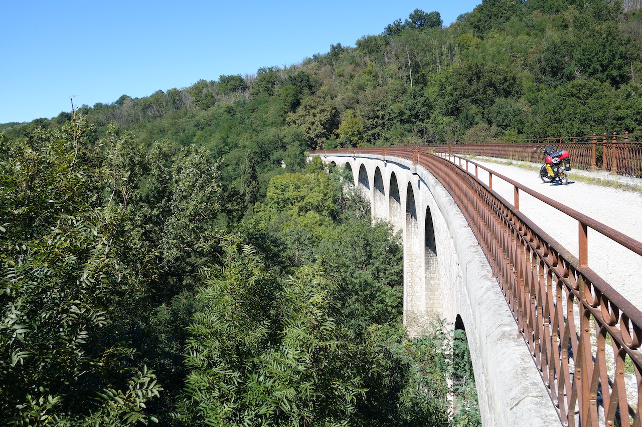 I am following the V.81 Piémont Pyrénéen bicycle route which goes coast to coast from the Atlantic Ocean to the Mediterranean. Just before Foix, I can take the voie Verte Saint-Girons / Foix. Immediately the old railway line goes over a spectacular bridge. I can recommend this voie verte.