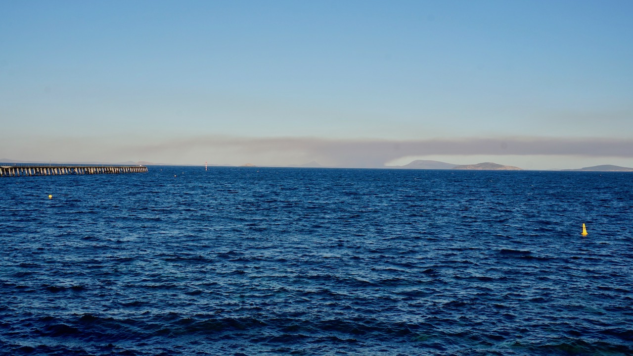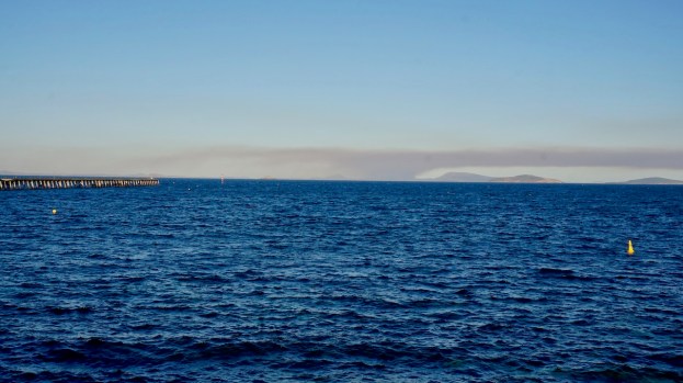 The while bay was covered in smog by late afternoon.