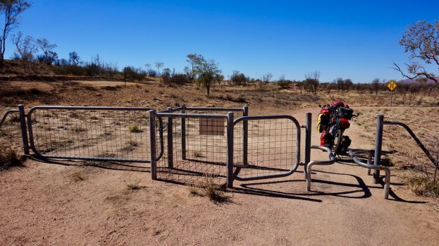 Simpsons Gap Bicycle Path runs from the outskirts of Alice Springs to Simpsons Gap. Loaded touring bikes cannot access the path. Gates are locked, the rest of the land sealed of by iron wires, so one must off-load the luggage. Same situation at the end of the path.