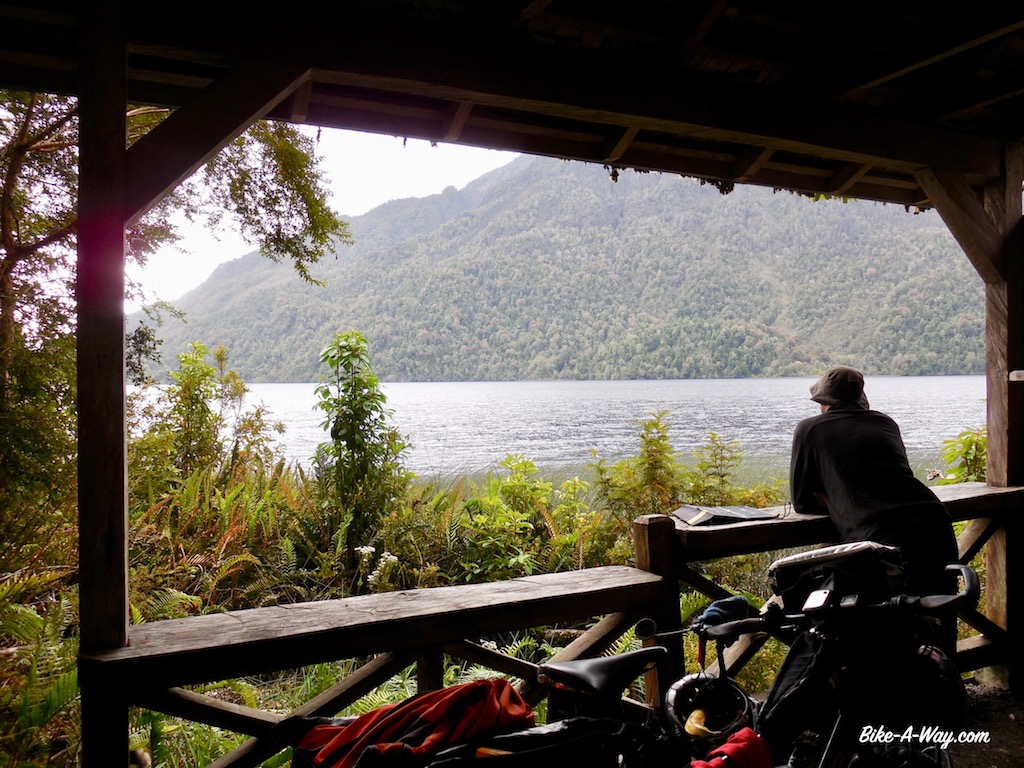 Previous Image Next Image DSCN2337 I camped along the Lago Blanco in National Park Pumalin. There are only 6 pitches or so, all having there own little shelter.